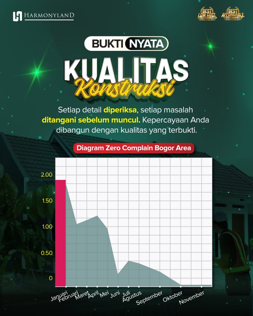 Diagram Zero Complain Harmony Land Bogor menunjukkan bahwa kualitas konstruksi bukan sekadar janji pemasaran. Selama periode pembangunan dan serah terima unit, komplain konstruksi dapat ditekan hingga titik minimal.